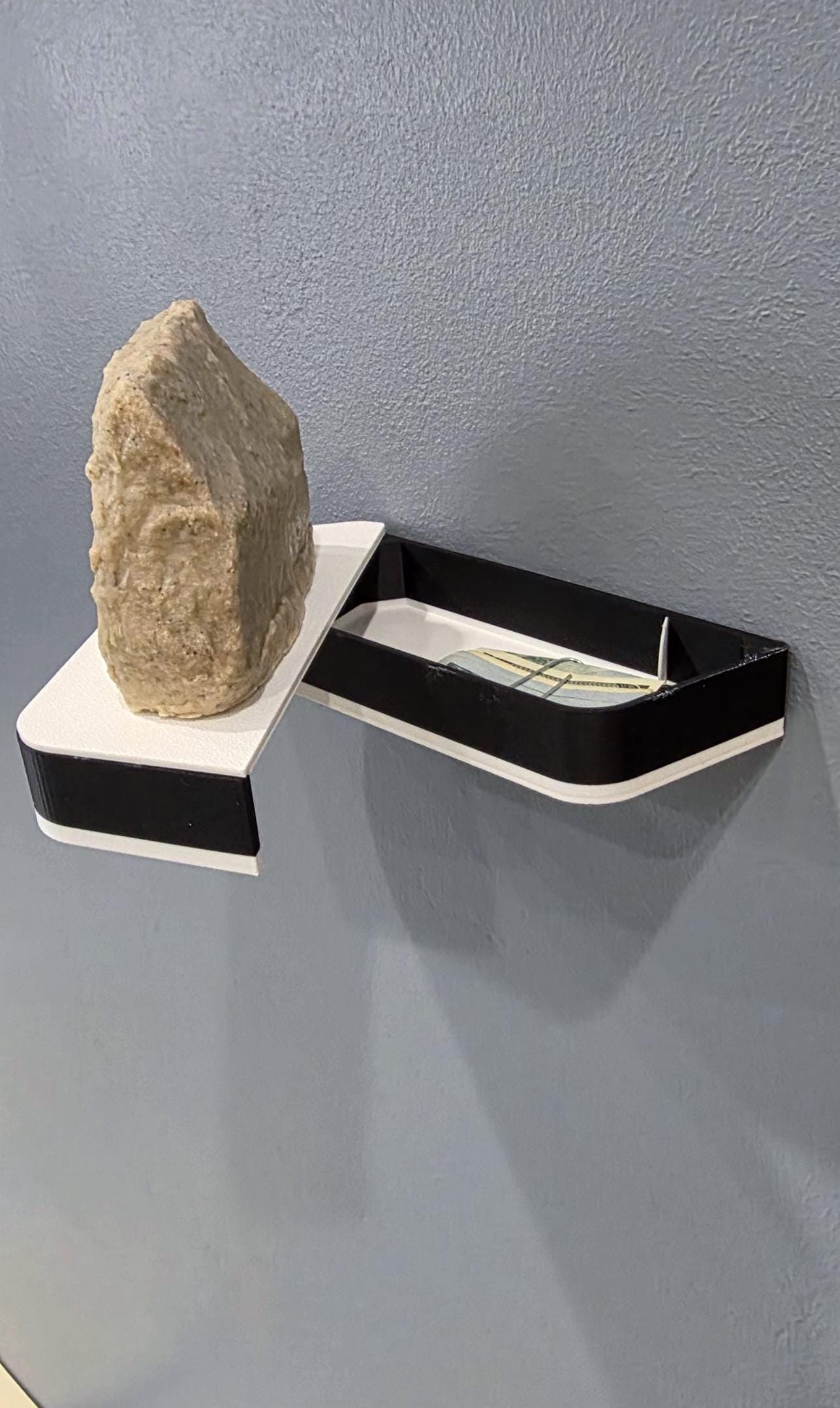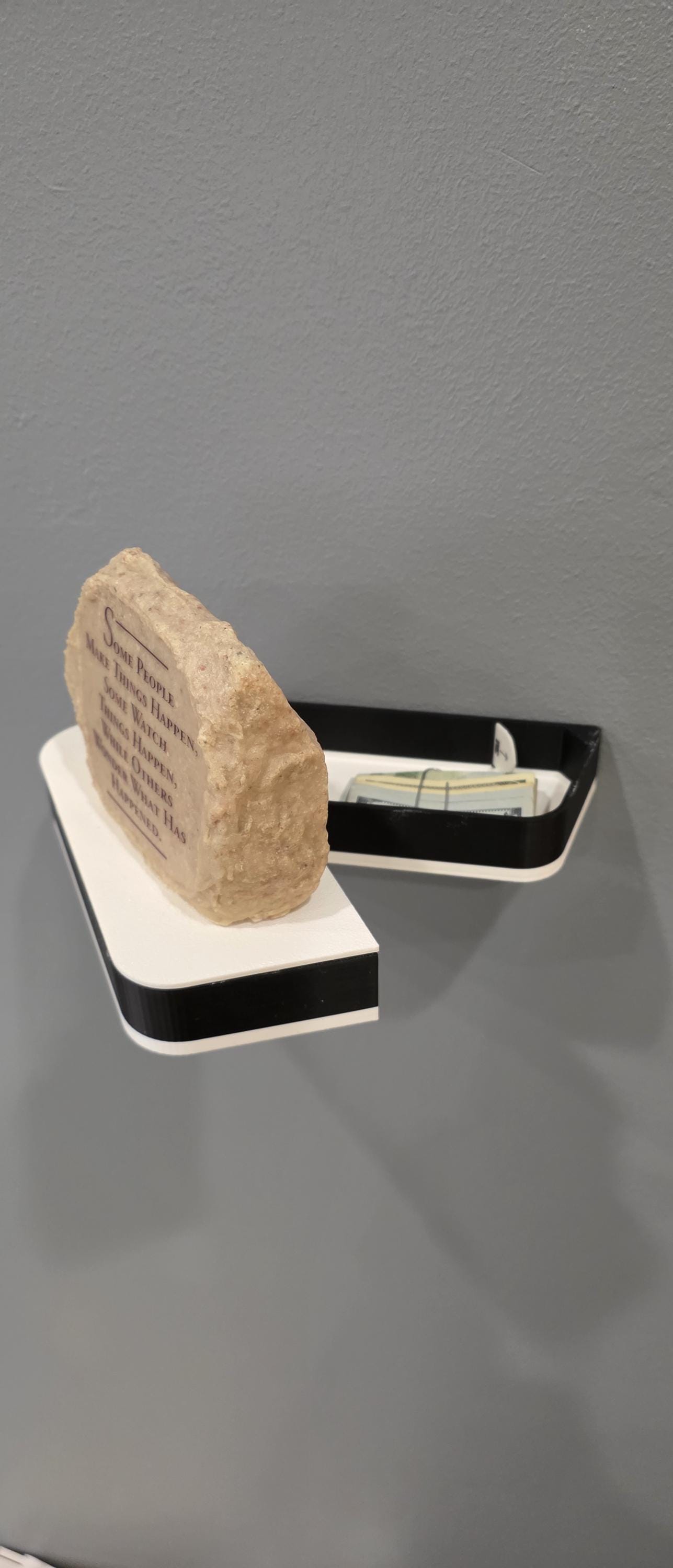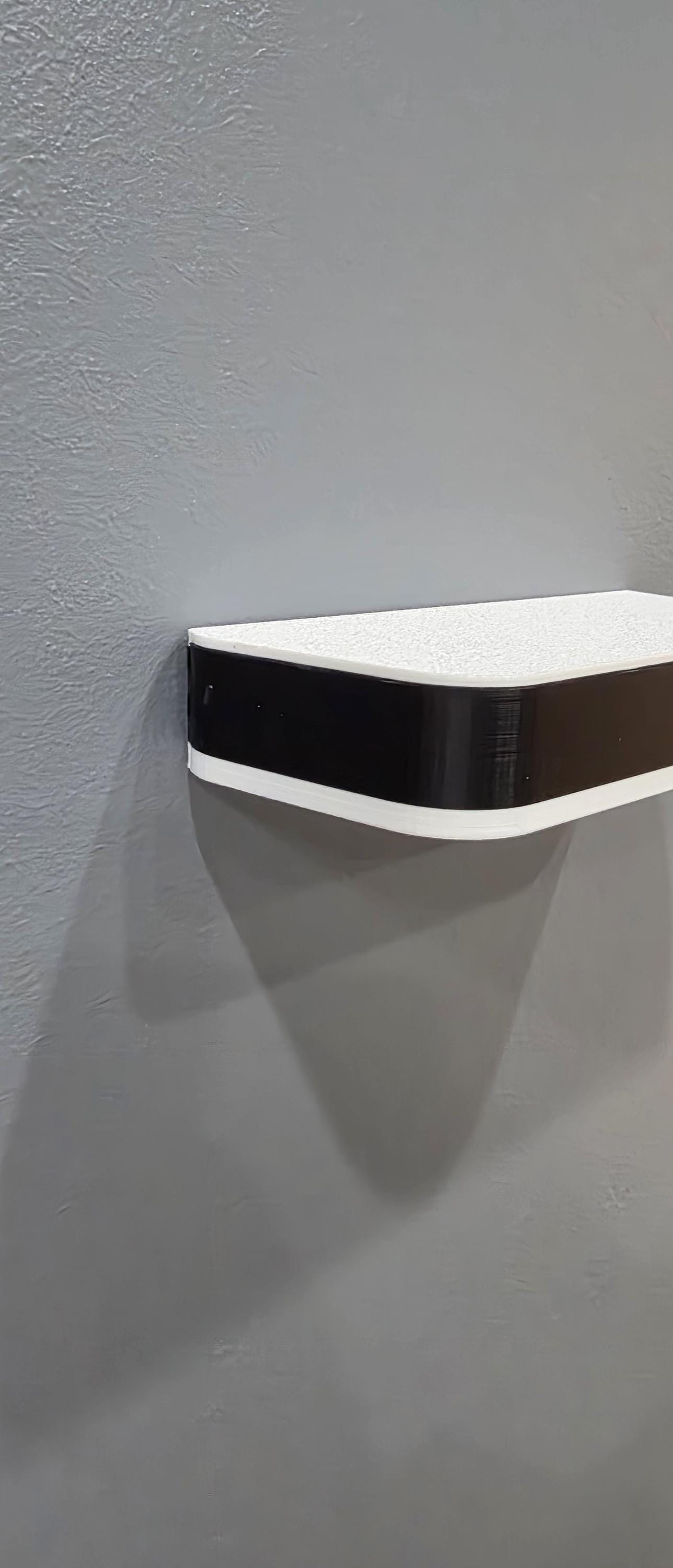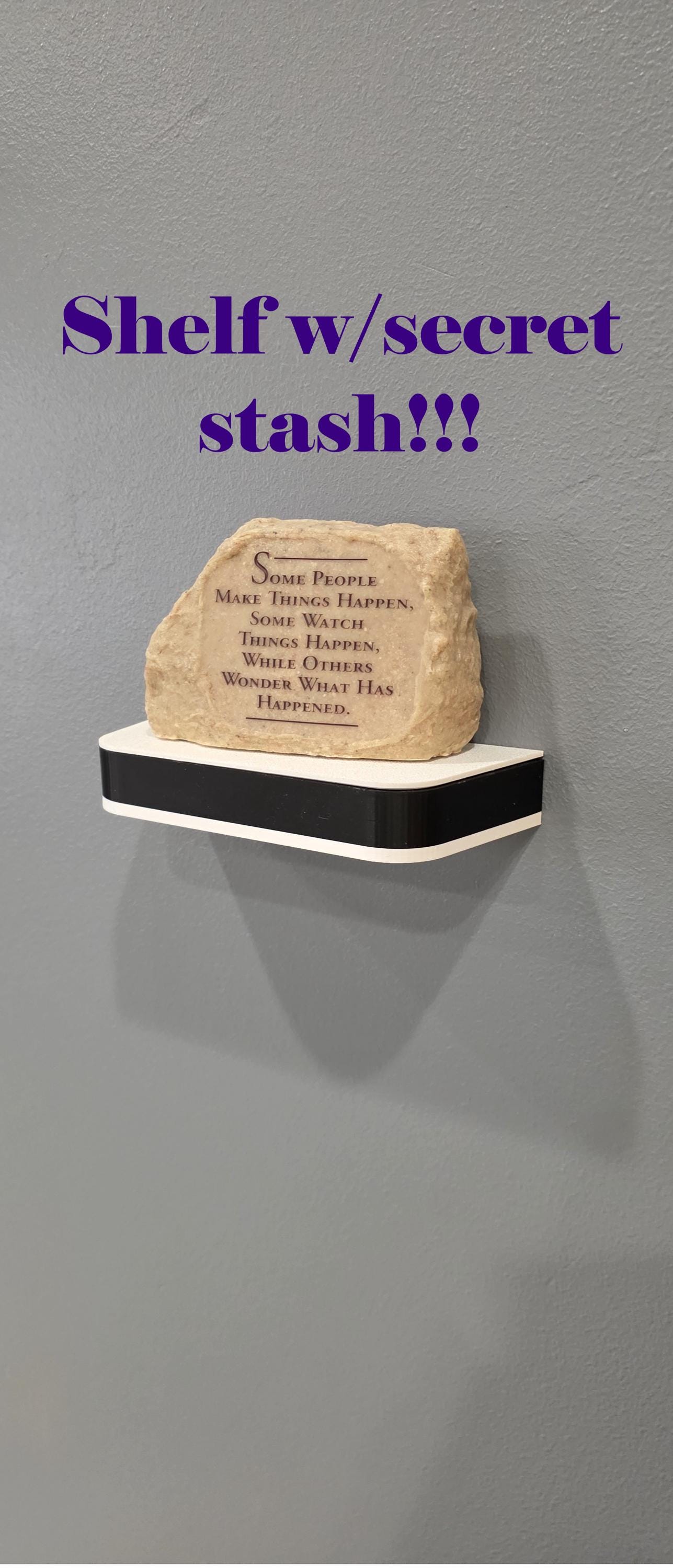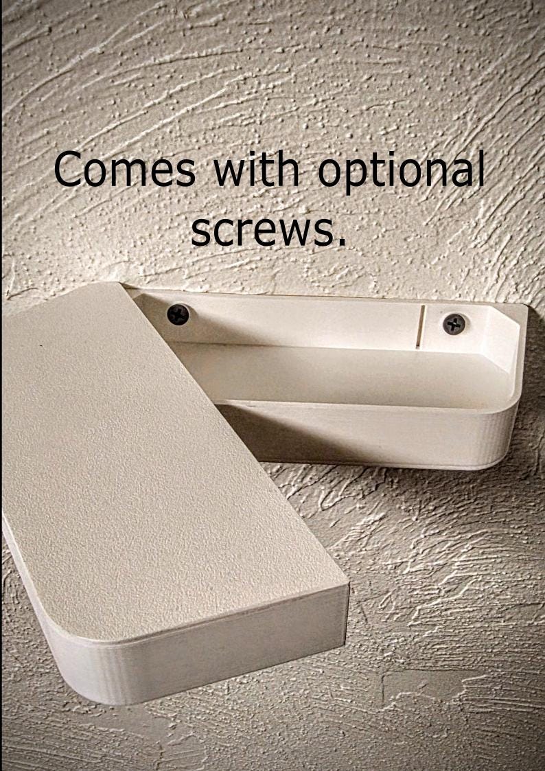 This sleek, 3D-printed floating shelf features a lid that opens smoothly on an internal hinge, unveiling a concealed compartment inside. It is robust enough to hold a medium-sized rock and comes in two color variations: the lid in one color and the body in another. To install, simply attach a command strip to the back, clean the wall, and apply it. Or install the two included drywall screws. You're all set to enjoy this functional and stylish addition to your space.
