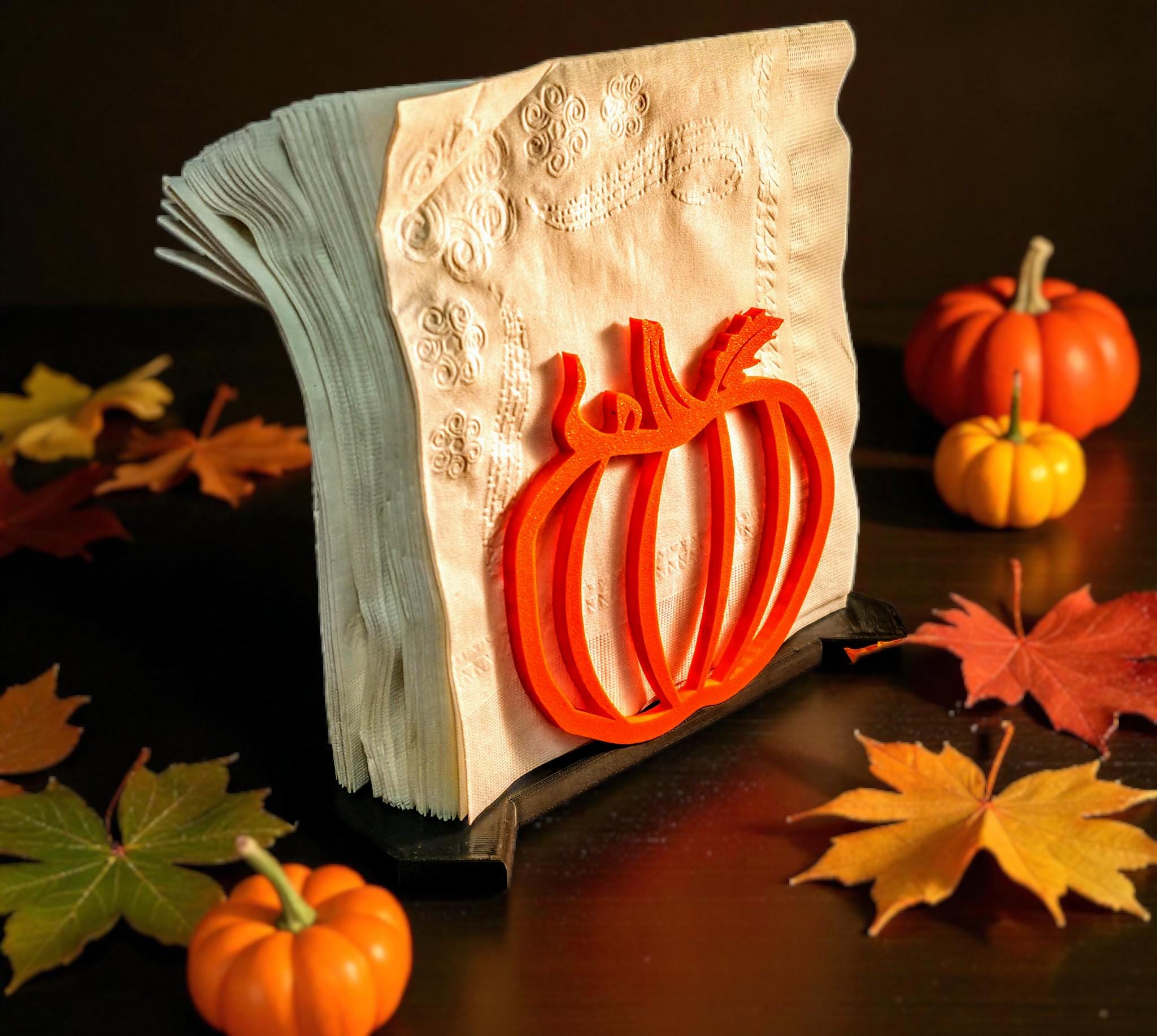 I am offering a beautifully crafted Thanksgiving Day or Halloween napkin holder, designed with both functionality and aesthetics in mind. This item is 3D printed, ensuring a robust and durable structure that can easily accommodate standard 6x6 napkins. The design features charming pumpkin motifs on either side, adding a festive touch that enhances your holiday table setting. The base is finished in a sleek black, providing a striking contrast that complements the vibrant colors of the pumpkins. This napkin holder not only serves a practical purpose but also acts as a delightful decorative piece, making it a perfect addition to your Thanksgiving celebrations.