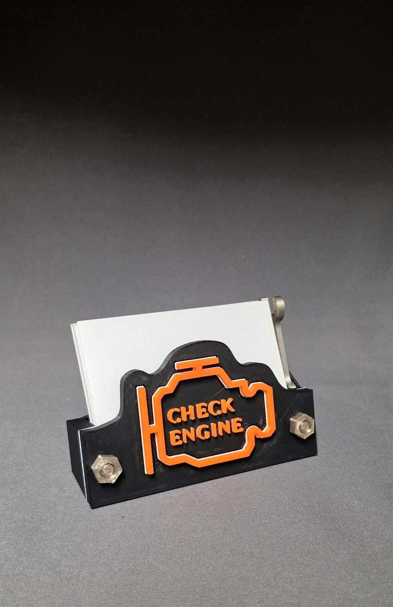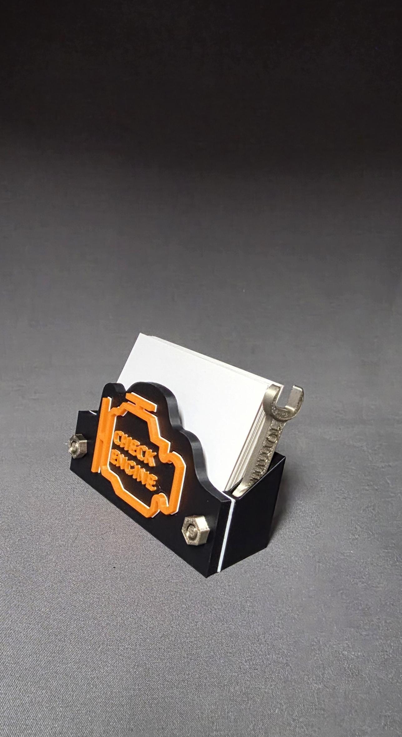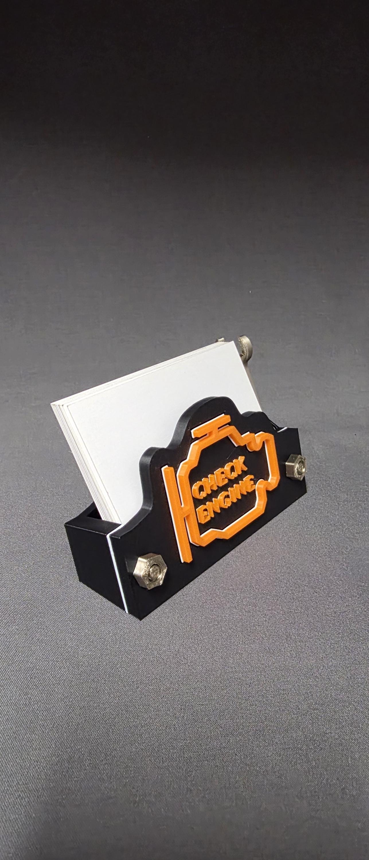 This 3D printed mechanic business card holder is a unique and engaging design that comes in several components: a back, front, gasket, nuts, and bolts. Assembly is straightforward, making it easy for any skilled mechanic to put together without difficulty. Its eye-catching feature is the ominous check engine light symbol, ensuring it stands out and captures attention effectively.