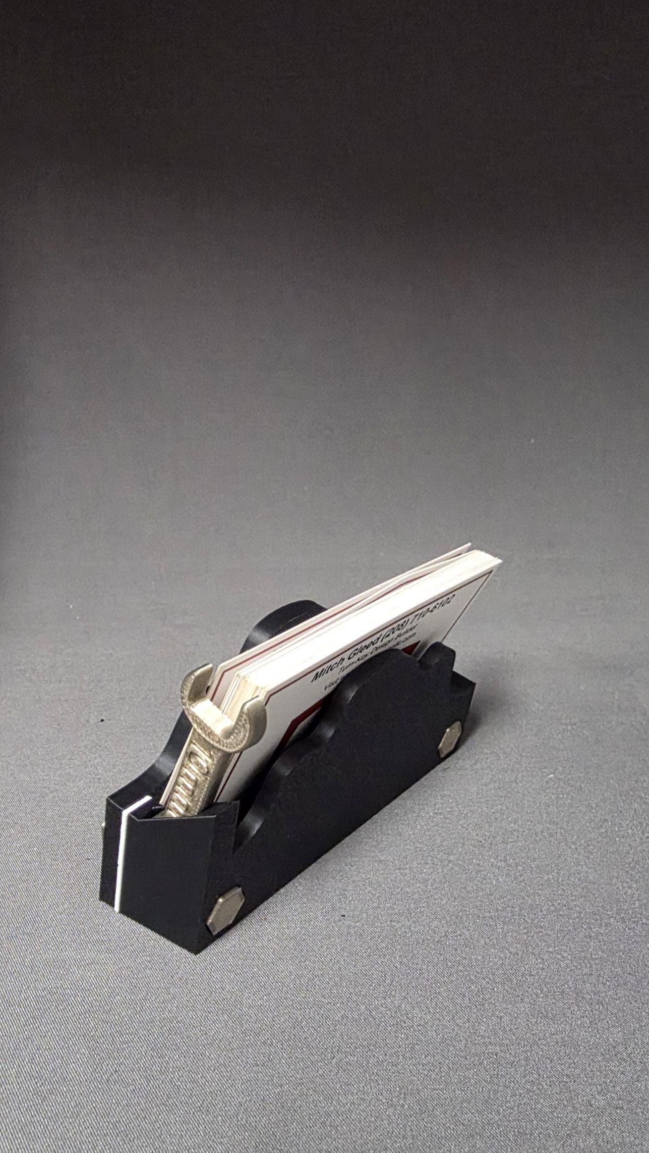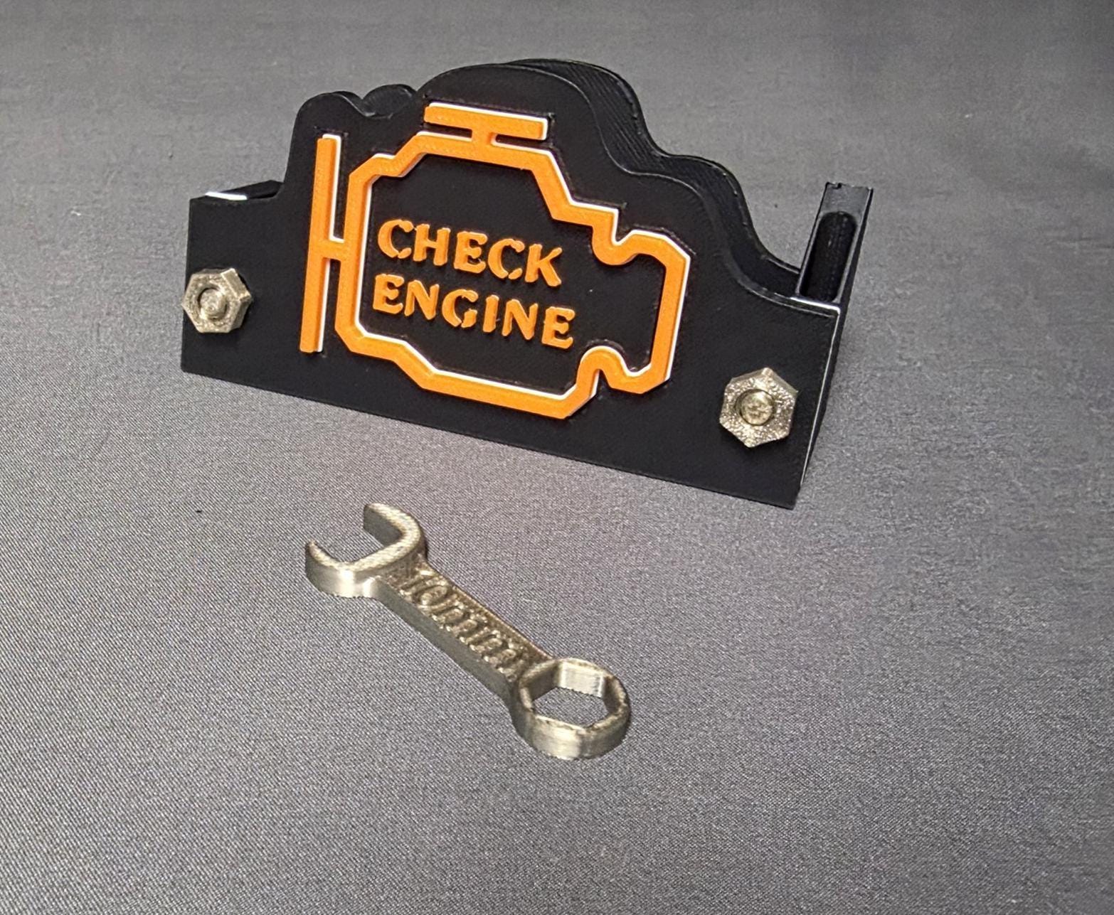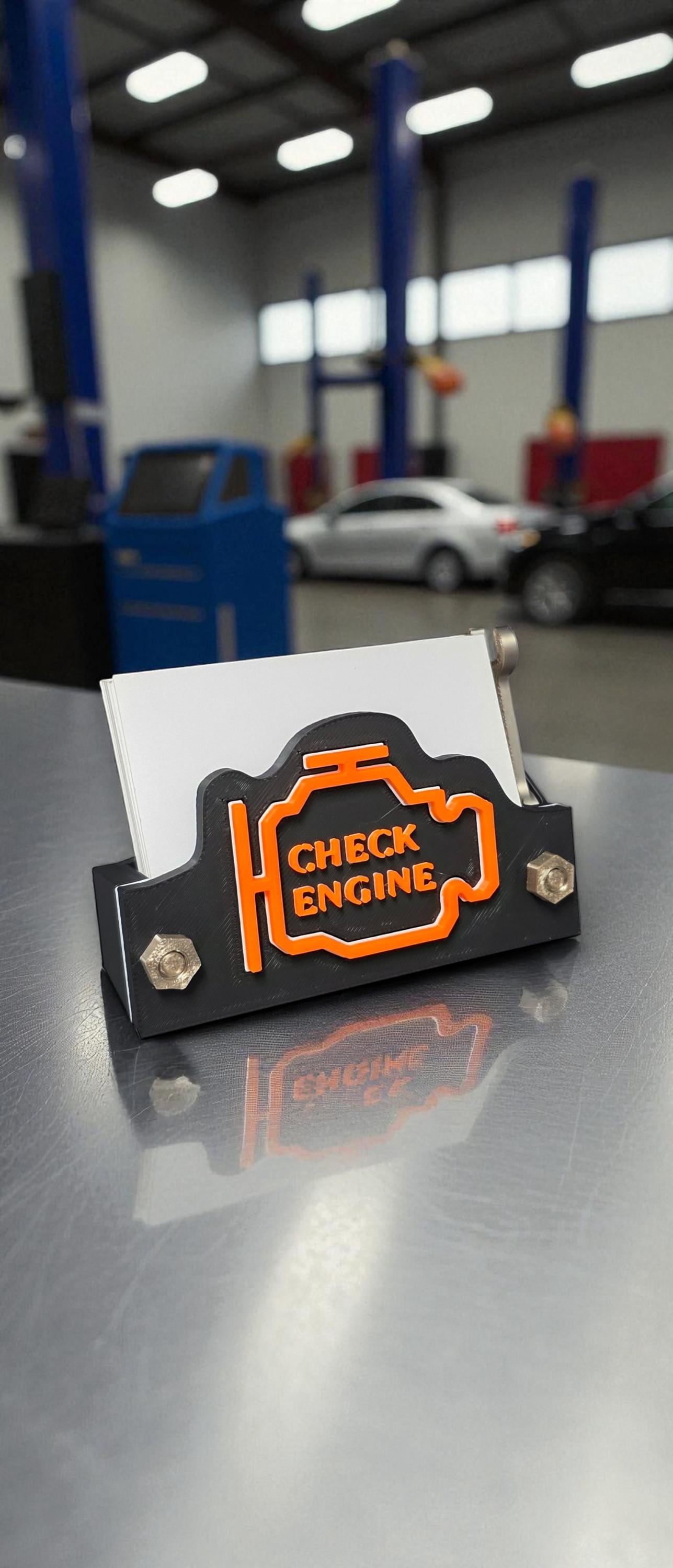 This 3D printed mechanic business card holder is a unique and engaging design that comes in several components: a back, front, gasket, nuts, and bolts. Assembly is straightforward, making it easy for any skilled mechanic to put together without difficulty. Its eye-catching feature is the ominous check engine light symbol, ensuring it stands out and captures attention effectively.