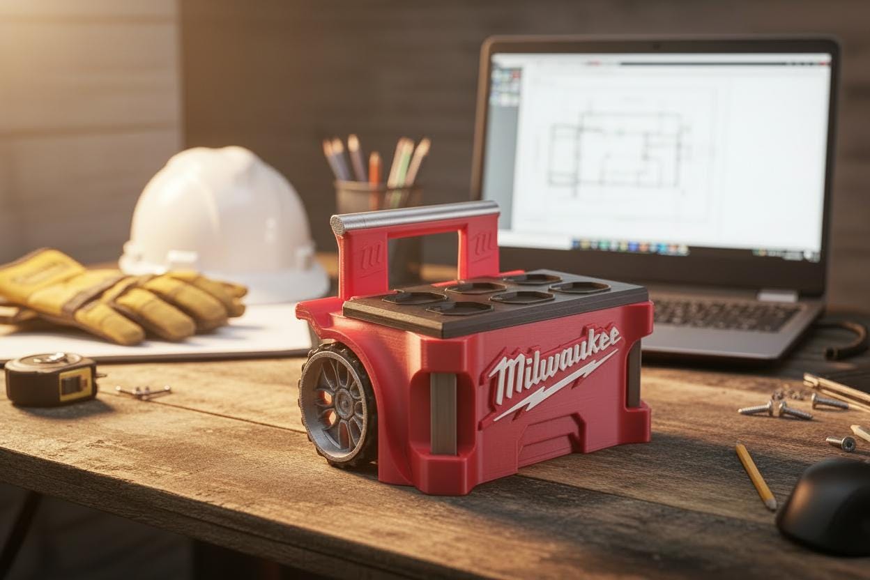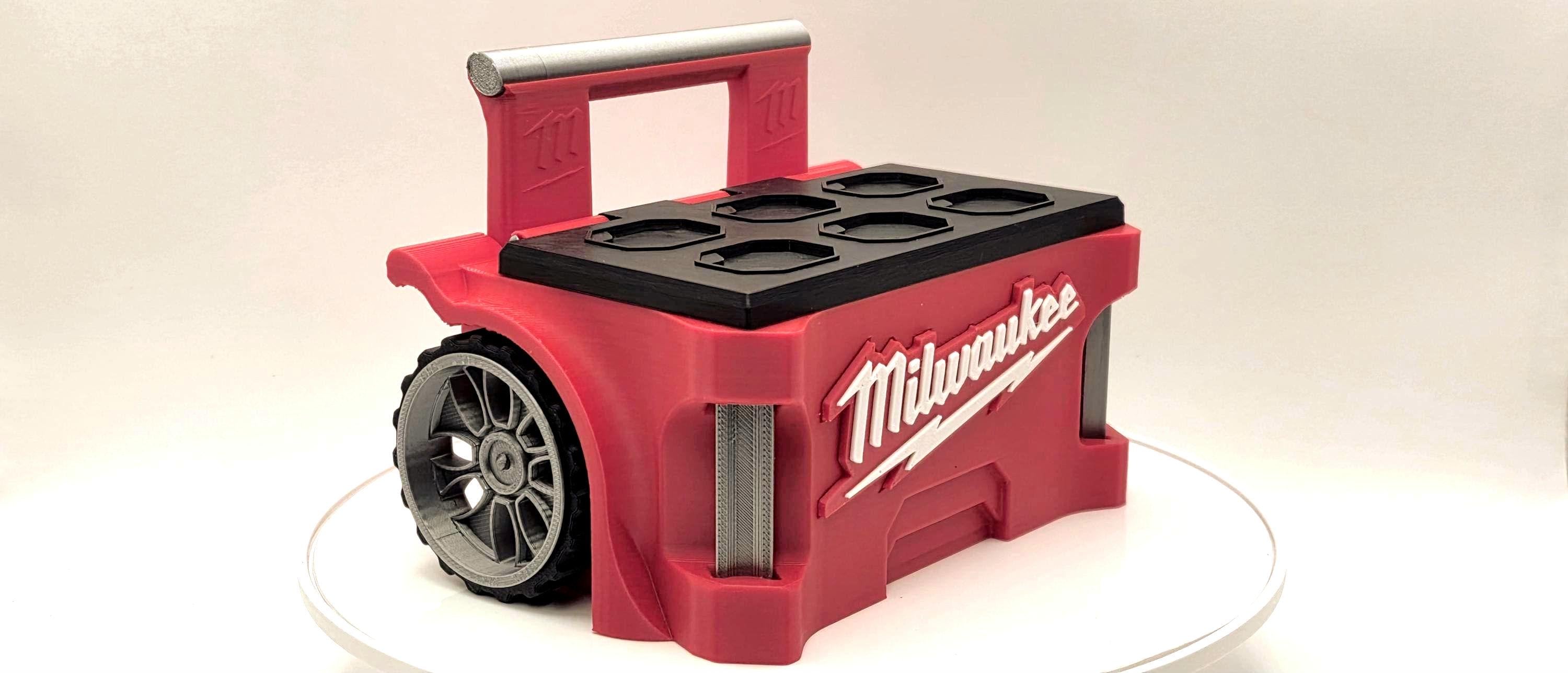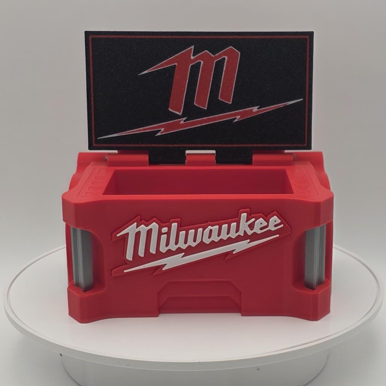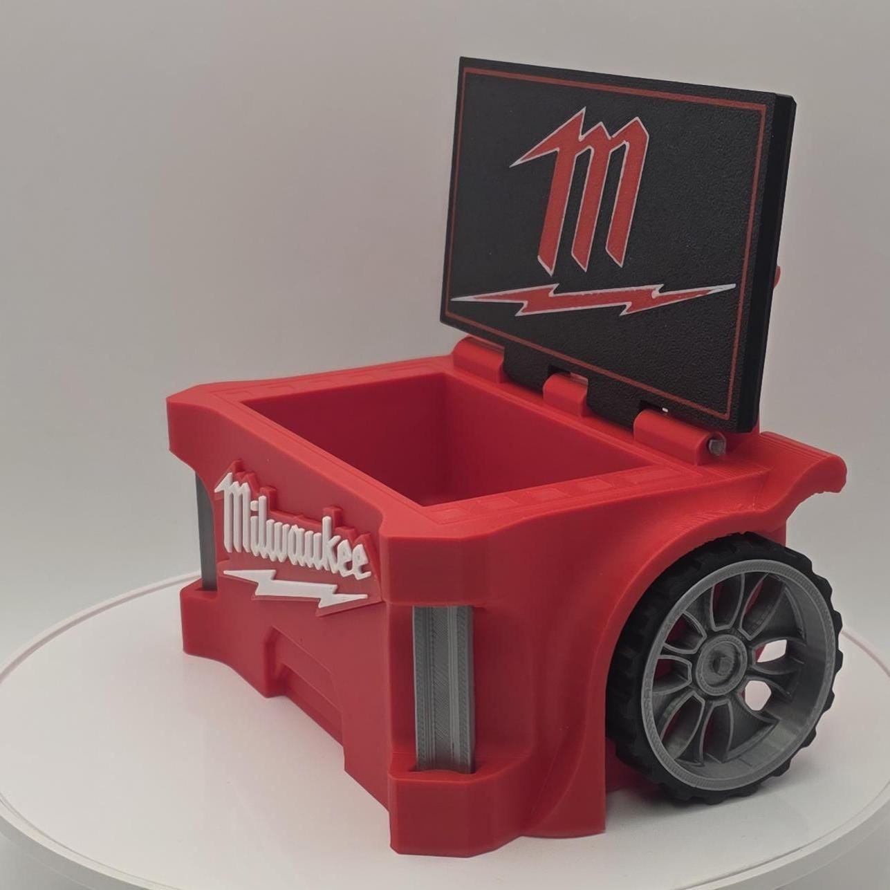 This unique 3D-printed business card holder, inspired by the Milwaukee Packout. Its eye-catching design not only serves a practical purpose but also acts as a great conversation piece. The holder features a flip-open lid adorned with a striking emblem on the inside, while both the wheels and lid are fully functional. This item is an excellent gift for Milwaukee fans, sure to be appreciated by clients and colleagues alike.